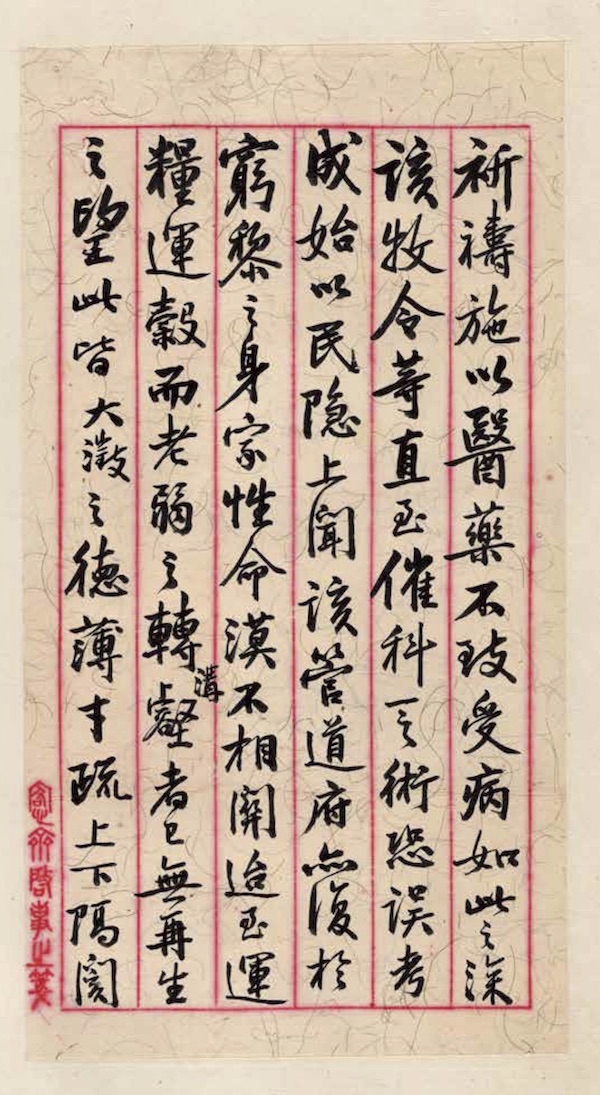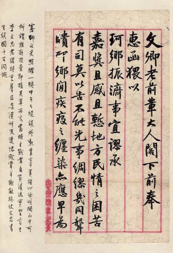 文卿老前輩大人閣下:前奉 惠函,猥以珂鄉(xiāng)振濟(jì)事宜,謬承 嘉獎(jiǎng),且感且慚。地方民情之困苦, 有司莫以告,不能先事綢繆,幾同聾瞆耶。鄉(xiāng)間疾疫之纏染,亦應(yīng)早為
