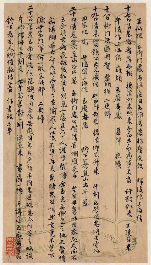 十九日 清晨寫鎮(zhèn)江大兄處信。研田叔岳來,楊清卿表叔來。午刻至砂皮巷晤王云孫, 回家祀先。午后寫上海信,至廣菴處。燈下纂《焦山志》半卷。