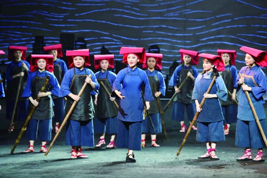 廣東省粵劇院排演的粵劇《紅頭巾》(編劇莫非,導(dǎo)演張曼君)展現(xiàn)了一群三水女人的奮斗史,以新加坡華人建筑女工群體為題材創(chuàng)作,獨(dú)特的歷史現(xiàn)象、別致的女性視角、濃郁的地域色彩,加上張曼君導(dǎo)演的詩(shī)性魅力,《紅頭巾》帶給觀眾的不僅是審美的享受,更有豐富而深刻的思想啟迪。值得一提的是,該劇的舞臺(tái)設(shè)計(jì)大量運(yùn)用抒情寫意的手法,用戲劇的當(dāng)代表達(dá)和創(chuàng)新手法講述歷史故事,產(chǎn)生新的藝術(shù)效果。姐妹結(jié)群坐在前往新加坡船底艙,從小孔中看到星光閃閃,寓意著她們雖然身陷囹圄但是未來(lái)曙光可見(jiàn),在異國(guó)他鄉(xiāng)的“紅頭巾”姐妹望海興嘆,望月思鄉(xiāng)……以景抒情、以景寫意的手法營(yíng)造出悲喜交加的情感氛圍,讓整個(gè)舞臺(tái)充滿詩(shī)意。