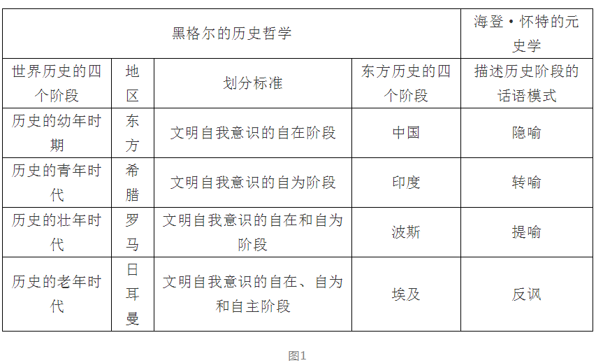 在《歷史哲學(xué)》中,黑格爾將世界歷史分為四個階段。(1)“歷史的幼年時期”:東方。(2)“歷史的青年時代”:希臘。(3)“歷史的壯年時代”:羅馬國家。(4)“歷史的老年時代”:日耳曼。他還將東方歷史分為中國、印度、波斯和埃及四個階段。[24]那么,如果以海登·懷特的元史學(xué)理論來看,黑格爾劃分歷史階段的標(biāo)準(zhǔn)是什么?為什么把東方作為“歷史的幼年時期”?為何把中國作為東方歷史的第一個階段?