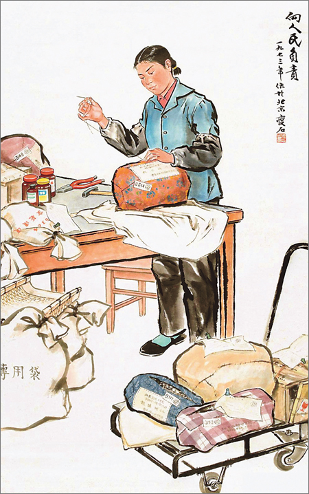 撫今追昔,當(dāng)再次面對著父親當(dāng)年創(chuàng)作的這幅表現(xiàn)郵政工人的繪畫,特別是父親題寫在畫上的“向人民負(fù)責(zé)”五個字時,使我更加意味深長地體會到了父親當(dāng)時的心境。