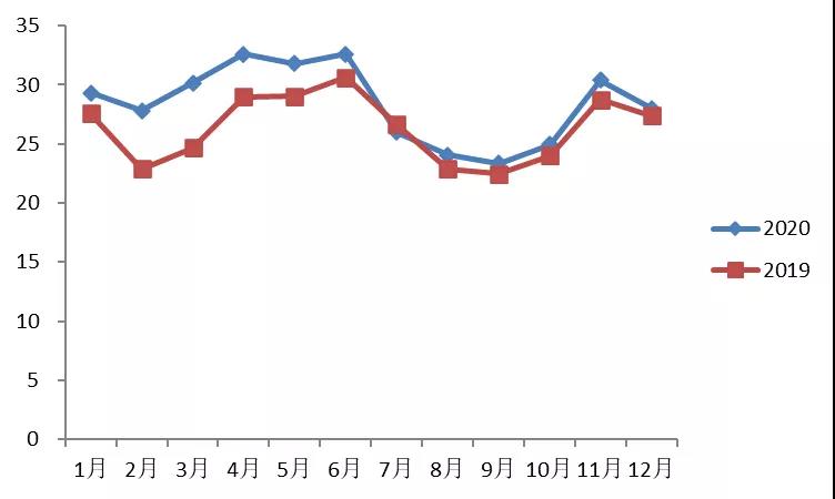 2019~2020年少兒圖書碼洋比重在各個(gè)月的變化