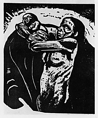 魯迅還特意把珂勒惠支的木刻《犧牲》投寄給《北斗》雜志,來表達(dá)他對(duì)柔石無言的紀(jì)念。這幅畫刻著一位瘦骨嶙峋的母親,悲哀地閉著眼睛,把她熟睡的孩子交出去,這位母親飽經(jīng)滄桑,悲哀而剛毅。在這木刻畫里,珂勒惠支寄寓了作為母親的巨大悲痛——?jiǎng)?chuàng)作這幅畫前不久,女畫家剛剛在一戰(zhàn)中失去了自己的長(zhǎng)子。兩年以后,《為了忘卻的記念》在《現(xiàn)代雜志》發(fā)表,后者為這篇文章配印的插圖就是這幅《犧牲》。今天,當(dāng)我們面對(duì)這幅木刻,似乎仍能聽到魯迅和珂勒惠支對(duì)扼殺年輕生命的黑暗世界所發(fā)出的無聲控訴。
