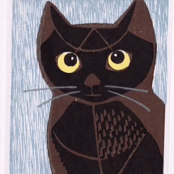 他以木版畫作品知名,早期的主題有自然風(fēng)景、城市風(fēng)光和靜物,但他最標(biāo)志性的作品就是上面這種具有現(xiàn)代主義風(fēng)格的貓咪版畫。