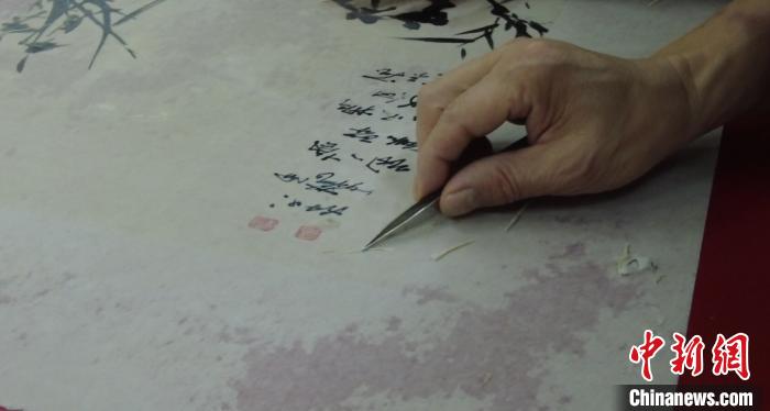 吳福明和他的徒弟正在修復(fù)一幅書畫。 李韻涵 攝