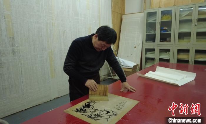 吳福明正在對一幅近代的書畫進(jìn)行揭裱。 李韻涵 攝
