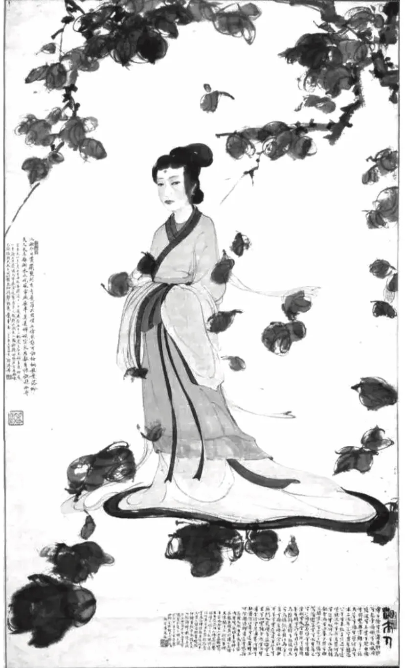 傅抱石一生創(chuàng)作了十余幅二湘圖,就人物風(fēng)格而言,1949年前后有顯著不同,抗戰(zhàn)時的“二湘”面露憂愁哀怨,而抗戰(zhàn)勝利后的“二湘”則神態(tài)和藹溫潤。1943年12月17日,傅抱石創(chuàng)作了首幅《湘夫人》,并于圖中自跋:“今日小女益珊四周生日,忽與內(nèi)人時慧出《楚辭》讀之,‘裊裊兮秋風(fēng),洞庭波兮木葉下’,不禁彼此無言。蓋此時強敵正張焰于沅澧之間。因相量寫此,即擷首數(shù)語為圖?!?944年,此畫在郭沫若壽宴中深得周恩來贊賞,其后郭沫若題詩相贈:“沅湘今日蕙蘭焚,別有奇憂罹此君。獨立愴然誰可語?梧桐秋葉落紛紛。夫人矢志離湘水,叱咤風(fēng)雷感屈平。莫道嬋娟空太息,獻(xiàn)身慷慨赴幽并?!眻D中湘夫人于畫面正中,愴然獨立于隨風(fēng)飄揚的落葉之下,目視前方,雖帶有精致典雅的妝容,但仍難掩神色之凝重與落寞。畫中人物寄托了傅抱石目睹沅澧戰(zhàn)火的痛苦悲憤,堅定了他愿為故土安定慷慨獻(xiàn)身的信念。郭沫若之詩使傅抱石之畫的價值與意義得以升華,并提升了作品的政治情懷。其后的二湘圖更加注重畫面動勢與人、景間的線墨對比。水波流向、枝葉風(fēng)向與人物衣裙飄動方向一致,畫面整體多呈對角線平衡或平行前進(jìn)態(tài)勢,加以似有似無的霧氣點染,更擴充了畫面的視覺深度與層次;精細(xì)嚴(yán)謹(jǐn)?shù)摹案吖庞谓z描”勾畫人物線條,縱恣橫掃的大塊墨色渲染出氣韻生動的山水之境,兩種不同的筆墨畫法對比增添了畫面的視覺沖突。一動一靜、一粗一細(xì),充分展現(xiàn)出傅抱石對人物畫創(chuàng)作的新思考。又如1944年創(chuàng)作的《湘夫人》圖,畫面整體呈由右上到左下的運動態(tài)勢,左上部留白,湘夫人手持折扇,踏波而行,回眸顧盼,神色悵然。水波、落葉、衣帶、發(fā)梢,還有湘夫人回眸方向均一致,仿佛畫面中真的有風(fēng)力呼之欲出,靈動自然,落葉近大遠(yuǎn)小的細(xì)節(jié)設(shè)計也增添了整幅圖的空間延展性。這不但再現(xiàn)了屈原《九歌·湘夫人》中“帝子降兮北渚,目眇眇兮愁予。嫋嫋兮秋風(fēng),洞庭波兮木葉下”所描繪的情境,而且亦傳達(dá)出詩人與畫家相隔千年的情感共鳴。