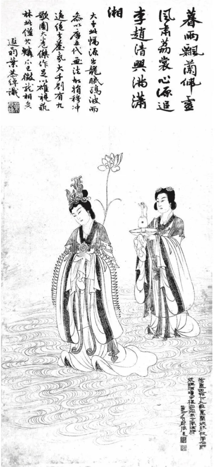 《湘夫人圖》明顯地表現(xiàn)出渾融貫通的色彩,既不像趙孟頫那樣純粹的清雅明暢,也不像陳洪綬那樣的詼詭清異,其能博采唐宋的雅麗而濟以敦煌的雄健,表現(xiàn)出中國人物畫的至高境界。就其人物形象來看,此畫湘君、湘夫人皆為女神,這與前述傅抱石一樣,取二人為舜帝二妃娥皇、女英之意。畫中湘君在前,風(fēng)姿挺拔,頭部微側(cè),眉目從容恬靜,一股超然出塵之氣,手捧的荷花亦是昂然卓立,是其卓異獨立氣質(zhì)的象征;對湘夫人的描繪合于其妾的身份,其身形小于湘君,手執(zhí)凈盤,正視前方,肅然卓立。二人腳下為一江之水,兩人高潔飄然的形象呼之欲出,頗有敦煌壁畫人物的神韻,而絕無清代仕女圖中病態(tài)懶散的氣息。從技法上看,此圖取法高古,其人物衣飾的描畫,簡捷疏朗,“以設(shè)法變其白描”,“行筆巧密”而“古澹明潔”,這正是張大千長期學(xué)習(xí)李公麟、趙孟頫的成果。其細(xì)部的勾勒筆法工謹(jǐn)而簡淡,而整幅畫的風(fēng)格卻氣脈貫通,軒然超絕,顯然是注入了敦煌人物畫的大氣靈動之態(tài)。要言之,張大千的《九歌圖》融會不同時期人物畫的優(yōu)長,為我所用,成就了傳統(tǒng)繪畫技藝在新時代的一條突圍之路,從而彰顯出傳統(tǒng)繪畫在中西文化劇烈沖突時代的強大生命力。