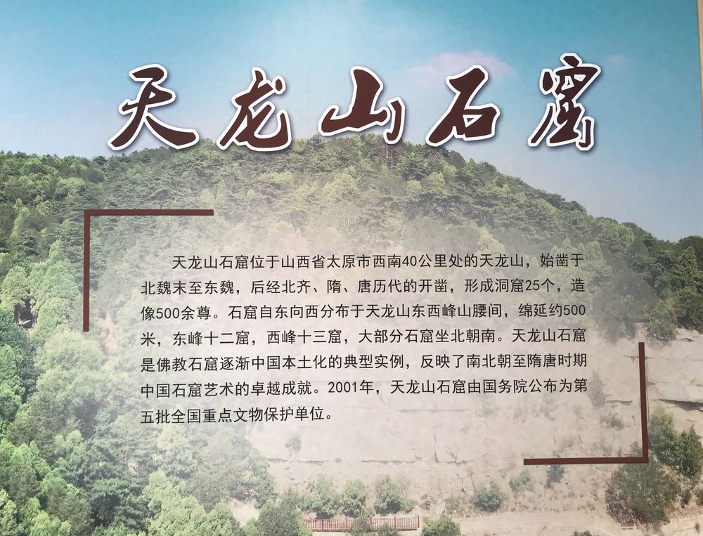 據(jù)介紹,天龍山石窟位于山西省太原市西南40公里處的天龍山,始鑿于北魏末至東魏,后經(jīng)北齊、隋、唐歷代的開鑿,形成洞窟25個,造像500余尊。2001年,天龍山石窟由國務(wù)院公布為第五批全國重點文物保護(hù)單位。