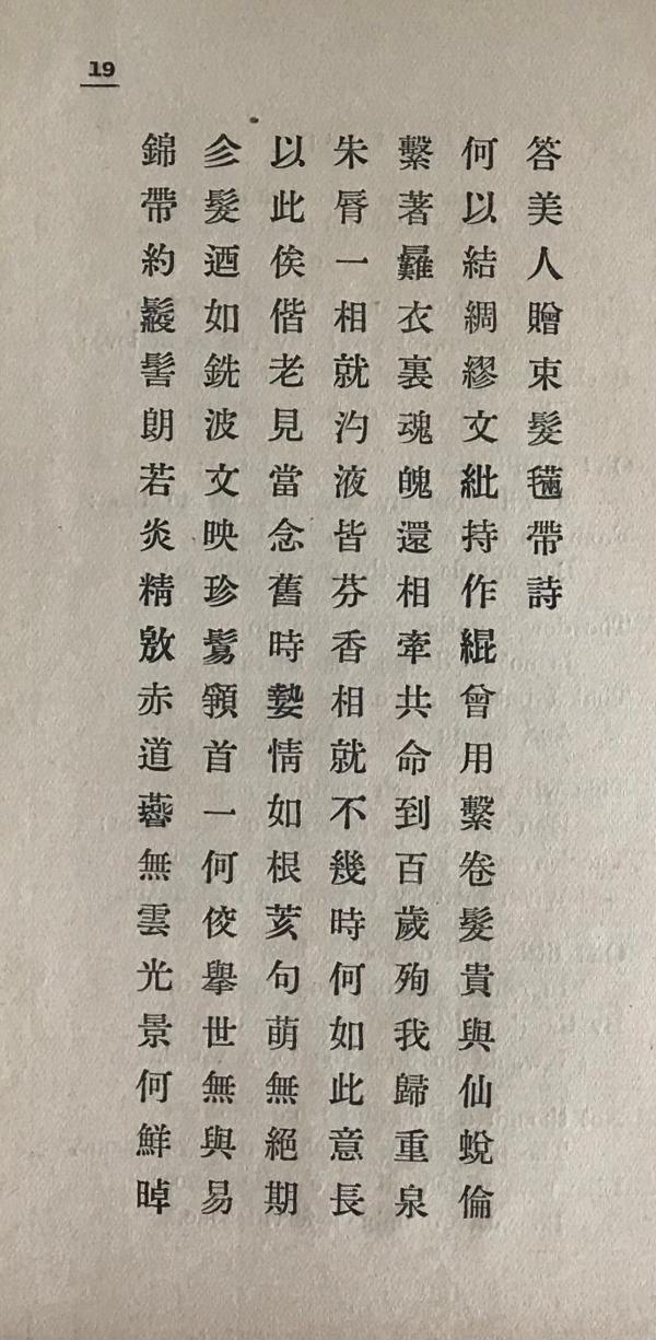 我收藏的《拜輪詩選》恰如柳亞子所說也是第三版,版權(quán)頁印的出版時間為“戊申九月十五日初版發(fā)行;壬子五月初三日再版發(fā)行;甲寅八月十七日三版發(fā)行”。這本書是三十二開的窄本,白色沖皮面精裝,封面書名燙金,封底印英文:拜倫詩曼殊阇梨譯;書前有曼殊西裝照,珂羅版印,法蘭居士(W. J. B. Fletcher)序和曼殊自序,另有H.R.Alice為《留別雅典女郎》詩作的曲譜插頁一張;正文每頁上半為英文下半為漢文,共收詩五首:《去國行》《留別雅典女郎》《贊大海》《答美人贈束發(fā)*帶詩》(按,*為異體字,具體見下圖)《哀希臘》。
