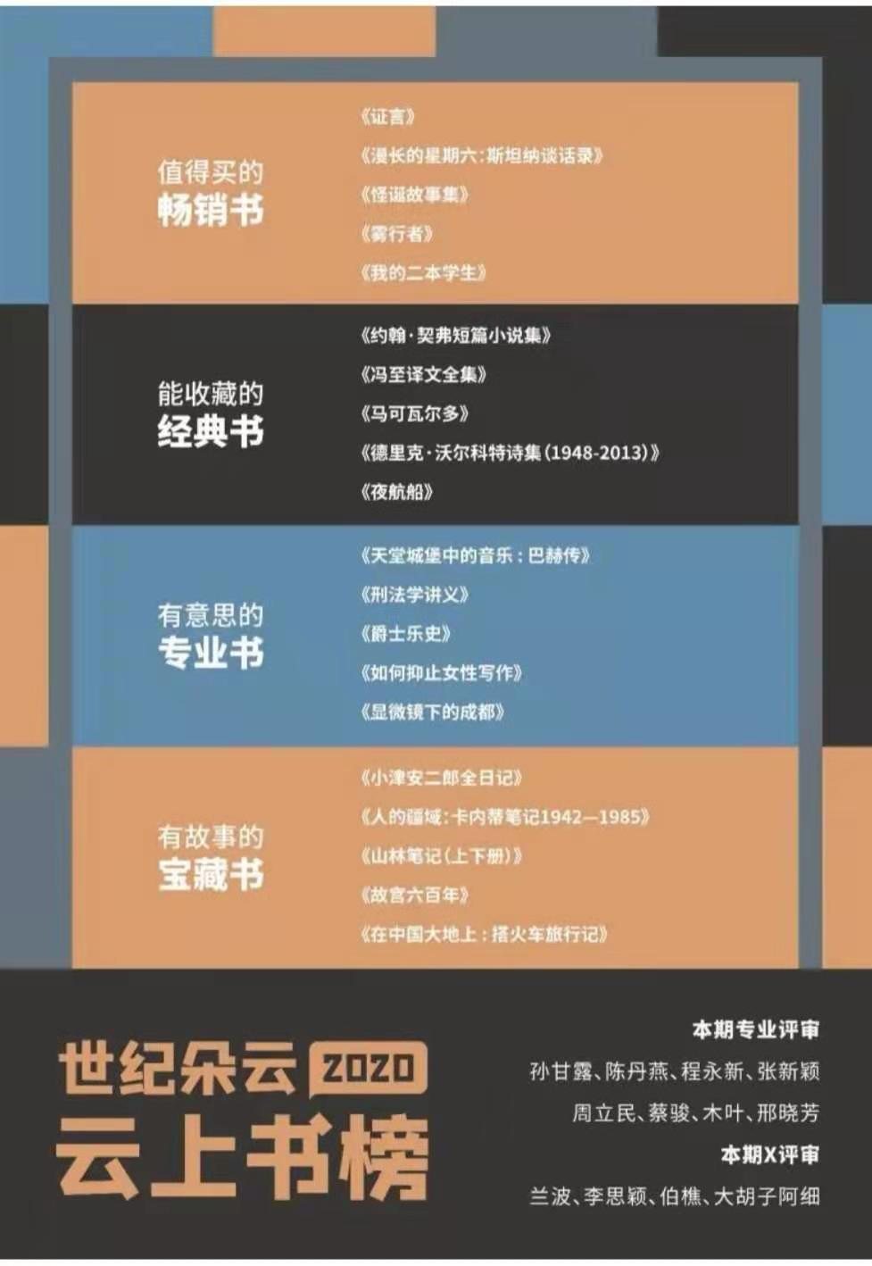 從2020年9月起, “云上書榜”至今已經(jīng)評選出六期榜單。年榜評選范圍是2020年出版的圖書,候選書單由前六期的上榜圖書和評審們的補充書單組成。最終評選出4大類別共20本上榜圖書。其中,“值得買的暢銷書”是《證言》《漫長的星期六:斯坦納談話錄》《怪誕故事集》《霧行者》《我的二本學生》;“能收藏的經(jīng)典書”是《約翰·契弗短篇小說集》《馮至譯文全集》《馬可瓦爾多》《德里克·沃爾科特詩集(1948-2013)》《夜航船》;“有意思的專業(yè)書”是《天堂城堡中的音樂 : 巴赫傳》《刑法學講義》《爵士樂史》《如何抑止女性寫作》《顯微鏡下的成都》;“有故事的寶藏書”是《小津安二郎全日記》《人的疆域:卡內蒂筆記1942—1985》《山林筆記(上下冊)》《故宮六百年》《在中國大地上 : 搭火車旅行記》。