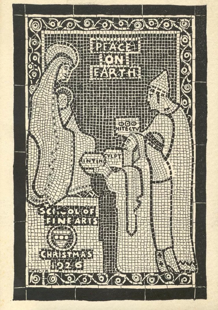 林徽因在賓大時就展露出設(shè)計方面的才華。1926年,她為美術(shù)學院設(shè)計了一張圣誕卡,采用馬賽克鑲嵌畫的風格,有點羅馬或者拜占庭的味道。畫中東方三博士手持禮盒上的字是painting(繪畫) sculpture(雕塑)和architecture(建筑),寓意造型藝術(shù)三姐妹。據(jù)梁再冰回憶,林徽因和梁思成還為此吵了一架。林徽因說這是她的創(chuàng)意,希望自己畫出來;但梁思成覺得自己畫得更好,應該由他來畫。林徽因說不行,大家都能看出這是你畫的,到時候我就穿幫了。
