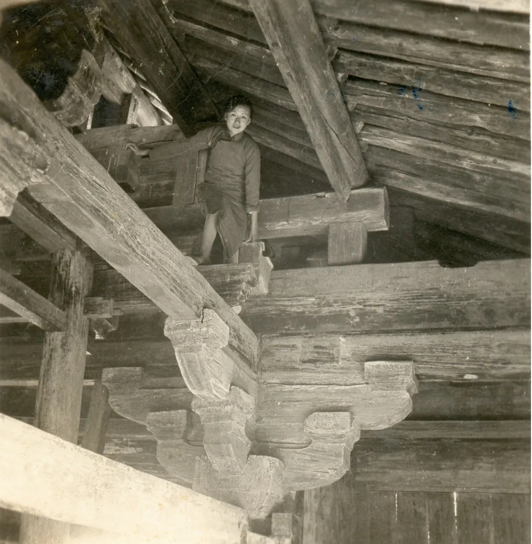 1933年林徽因在河北正定開元寺鐘樓梁架上