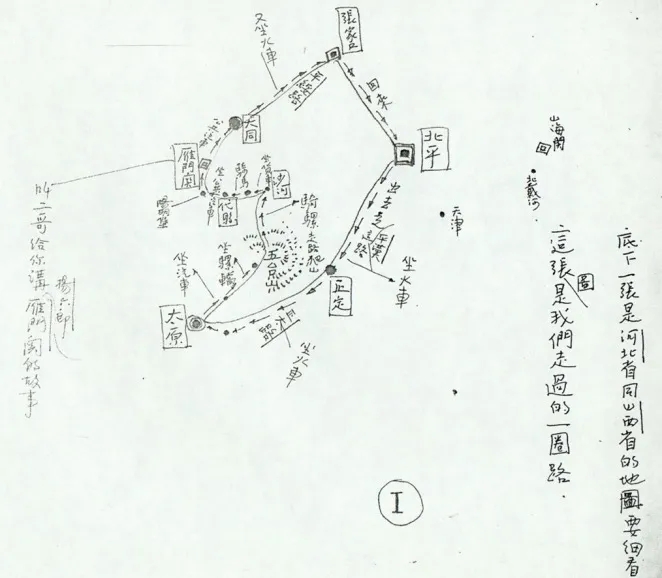 林徽因的文體又變了,和寫詩、寫建筑學論文不同,跟小孩子寫的文字是這樣的。她還詳細畫了一張圖叫“我們走過的一圈路”,讓孩子在這么危急的關(guān)頭還順便學一學地理知識。