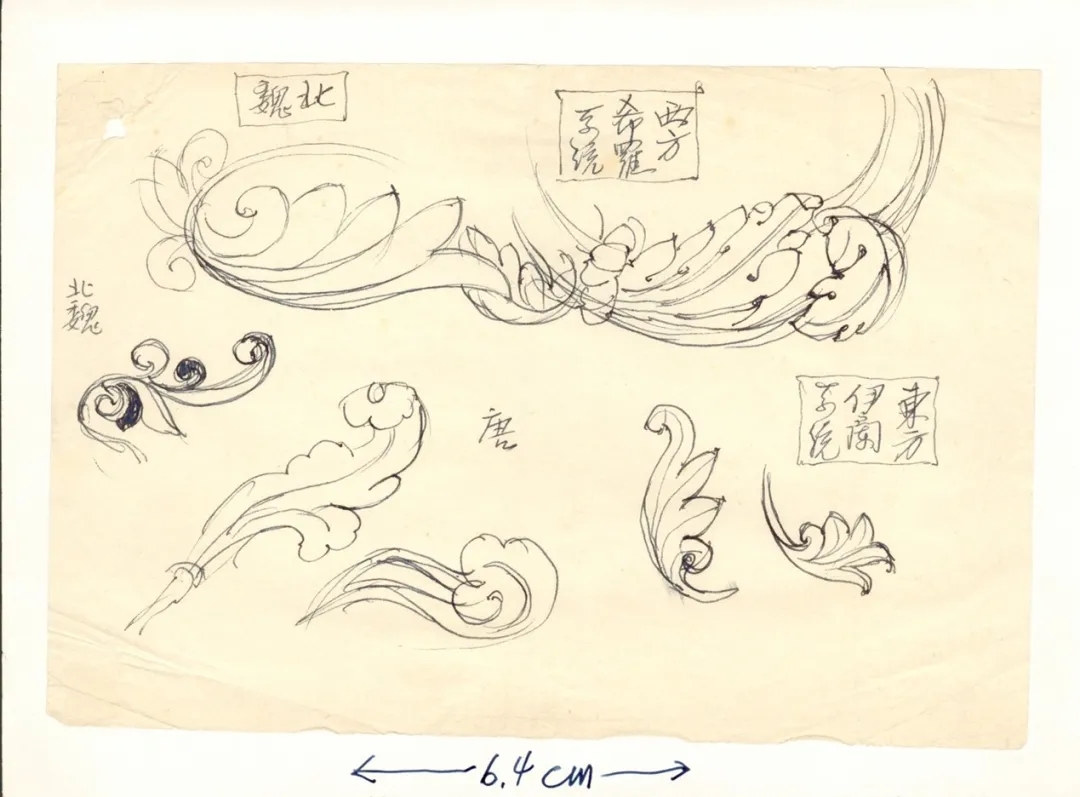 此時期林徽因還在做一些建筑史的研究,可惜只有殘缺的稿子,沒有最終完成,是繼云岡石窟以后對敦煌石窟紋飾的研究——《敦煌邊飾初步研究稿》。此時她已經(jīng)能輕松地畫出北魏、唐代紋飾什么味道,波斯以及希臘紋飾又是什么味道。