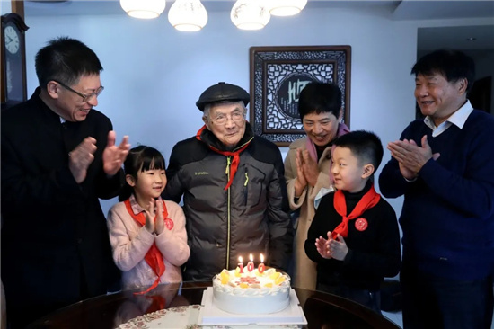 按照“虛歲”說法,2月16日是圣野先生的百歲生日。春節(jié)前夕,上海市文聯(lián)、上海民協(xié)相關(guān)領(lǐng)導(dǎo)來到了圣野先生家里,為他舉辦了一個特別又暖心的生日會。
