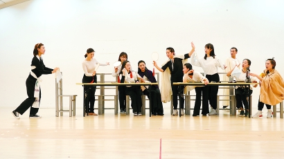 2019年底,喻榮軍編劇、中央戲劇學(xué)院教授曹艷執(zhí)導(dǎo)的《紅樓夢》進入籌備期。2020年8月,進入第一階段工作坊,近20位演員一起探索《紅樓夢》話劇表現(xiàn)方式。“我們用了兩三年尋找形式,要有傳統(tǒng)元素,又要有當(dāng)代性,不是簡單的復(fù)制和堆砌?!庇鳂s軍以演員“怎么走”為例,“肯定不是穿著高跟鞋的走法,但也不能變成戲曲臺步。我們需要找到平衡,嘗試形成話劇、戲曲、現(xiàn)代舞交合而成的角色身韻?!薄都t樓夢》工作坊請來上海昆劇團演員教大家戲曲形體動作,包括云手、提步、圓場,講解戲曲中的舉手抬足。大家常常為一個動作的精準反復(fù)練習(xí)一下午,對著鏡子一遍遍拗造型,在角落揣摩如何每次抬手到同一角度,用左手調(diào)整著右手。