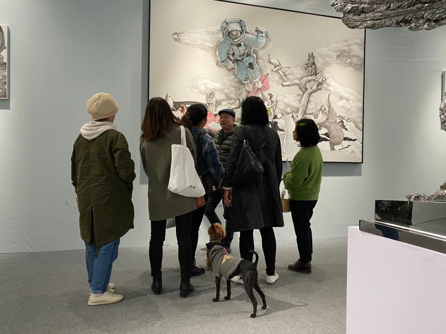 藝術(shù)家傅榆翔向參觀者介紹自己的作品。新華社發(fā) 周天健 攝