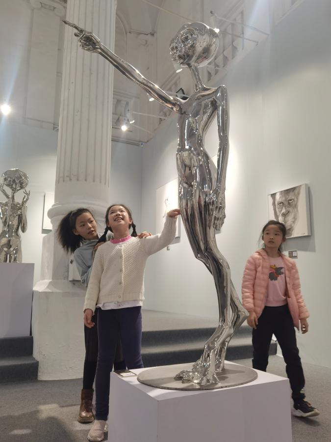 “媽媽,你看那站著一個(gè)外星人!”一位觀展的女孩指著一尊外星人雕塑說。展廳內(nèi),這尊外星人雕塑矗立在幾根白色古羅馬柱間,陽(yáng)光透過拱窗照在不銹鋼質(zhì)地的雕塑上,反射出冷冽的金屬光澤。“現(xiàn)代的雕塑精美又特別,和傳統(tǒng)建筑的展廳形成強(qiáng)烈對(duì)比,激發(fā)了我對(duì)宇宙的思考和想象。”觀展的陳先生表示,這樣的當(dāng)代藝術(shù)展很新奇。