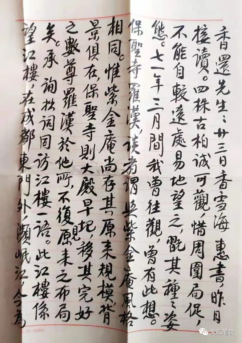 香還先生:廿三日香雪?;輹?,昨日接讀。四株古柏可觀,惜周圍局促,不能自較遠處易地望之,玩其種種姿態(tài)。七一年三月間我曾往觀,曾有此想。保圣寺羅漢,讀者謂與紫金庵風格相同。唯紫金庵尚存其原來規(guī)模,背景俱在,保圣寺則大殿早圮,移其完好之數(shù)尊羅漢于他所,不復見原來之布局矣。承詢拙詞同訪江樓一語。此江樓系望江樓,在成都東門外,瀕岷江,今為公園。當年朱先生寓居望江樓對面,地名宋公橋,我往訪,輒過橋同登望江樓吃菜,自于成都分別之后,未嘗再謀面,其時為一九四五年八月將盡。懷想彼時談敘之樂,能不感慨乎。尊大人年近八十,想必康健。其居何街何弄,侍奉者何人,均愿知之。語我作適當鍛煉,甚感,唯養(yǎng)成習慣為難,而又無人為之督責。平時只在室內(nèi)或庭中來回踱步,得伴則近處走走耳。匆復不一,即請