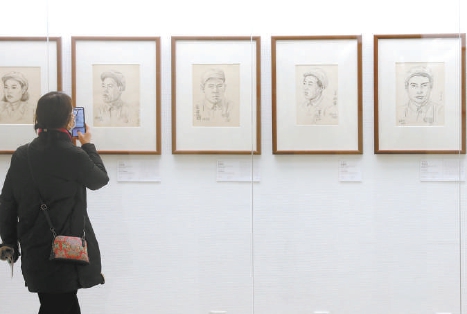 一幅幅英模人物的素描肖像引得觀眾駐足觀看。本報(bào)記者 饒強(qiáng)攝