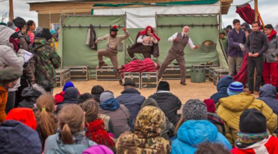 我和設(shè)計(jì)師喬納森·范森決定在服裝上借鑒20世紀(jì)30年代的左翼巡演劇團(tuán)風(fēng)格,比如瓊·利特爾伍德和尤安·麥科爾的“行動(dòng)劇場(chǎng)”。披上幾件斗篷,戴上幾頂帽子,在戲服的剪裁和樣式上能與伊麗莎白時(shí)期的服裝有幾分神似。在之前的兩次巡演中,我們與勞拉·福里斯特-海和比爾·巴克利這兩位作曲家合作,將一系列歌曲和配樂(lè)組合打造成了獨(dú)具風(fēng)格的演出配樂(lè)。溫暖的民謠歌曲能緩和氛圍,也消除了觀眾們對(duì)莎士比亞和哈姆雷特這兩個(gè)名字的敬畏。為了讓多才多藝的演員、歌唱家都能大展拳腳,我們?cè)谂錁?lè)上加入了更多的音樂(lè)元素:響亮的喇叭吹奏、鬼魂現(xiàn)身時(shí)營(yíng)造氛圍的刮擦聲、用于場(chǎng)景過(guò)渡的尖利小提琴聲、伴隨奧菲利婭出場(chǎng)的柔和管風(fēng)琴旋律,還有渲染緊張氣氛的鼓點(diǎn)。這些配樂(lè)全都是現(xiàn)場(chǎng)演奏,且都在眾目睽睽之下完成。環(huán)球劇院的舞臺(tái)上沒(méi)有秘密:秀就要秀出全部。