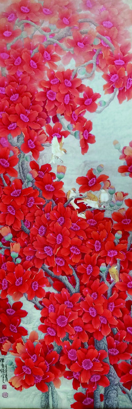 這幅《花開(kāi)有聲》的獨(dú)特之處還在于畫(huà)家表現(xiàn)的角度,不是慣常的仰視或平視的角度,而是采取一種聚焦,以及層層推進(jìn)的手法,刪去無(wú)關(guān)緊要者,集中地聚焦于對(duì)花的描寫(xiě),如此集中而強(qiáng)烈鋪排的藝術(shù)手法,卻是過(guò)去畫(huà)木棉者所少見(jiàn)的,這也體現(xiàn)了陳奕純勇于突破傳統(tǒng)的膽量。從人們所意想不到之處落筆,便成就了一種新鮮的藝術(shù)的感動(dòng)。