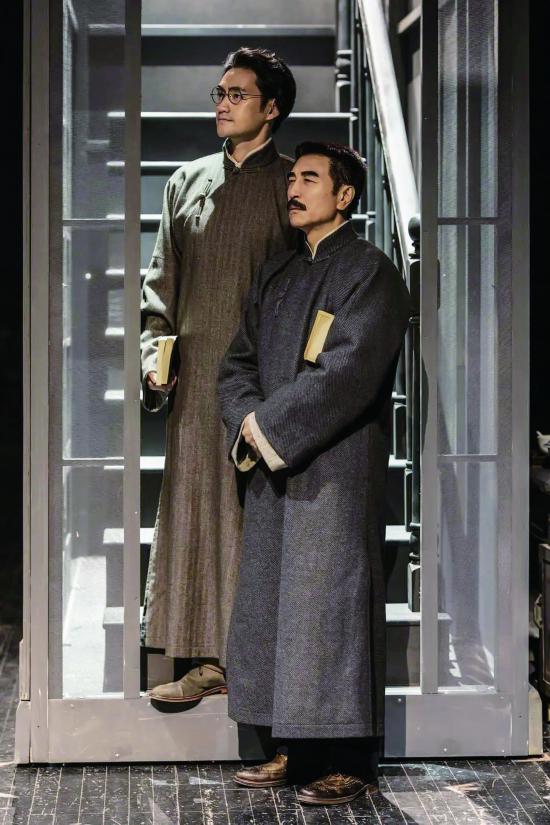 除人物形象的個(gè)性和鮮活外,幾代青年之間的人物關(guān)系又是微妙的。首先,2020年和1930年的兩組師生關(guān)系相互對(duì)照,都是由老師引導(dǎo)學(xué)生進(jìn)行文藝創(chuàng)作。其次,三代青年都遇到了相似的困難,第一幕現(xiàn)實(shí)時(shí)空的左浪對(duì)姚遠(yuǎn)說(shuō):“我還是覺(jué)得我們現(xiàn)在考慮太片面,太簡(jiǎn)單了,有點(diǎn)幼稚”,隨后歷史時(shí)空的馮鏗也向魯迅提到“他們都說(shuō)我們的文章缺乏技巧,文字幼稚”;王近對(duì)學(xué)生們說(shuō),“你們現(xiàn)在遇到的困難,和當(dāng)年的編劇應(yīng)該是一樣的”,而這位“當(dāng)年的編劇”正是青年時(shí)期的王近自己。最后,三代青年面對(duì)困難時(shí)的精神是一脈相承的。1930年魯迅對(duì)五位青年說(shuō):“青年的文藝,乃是青年的反抗,青年求索的過(guò)程”,“幼稚會(huì)生長(zhǎng),會(huì)成熟,你們現(xiàn)在的創(chuàng)作,就如同壓在巖石下面的植物,雖然并不繁榮,但卻在曲曲折折的生長(zhǎng)”。受此啟發(fā),五烈士即使在艱苦的獄中也自制“筷筆”繼續(xù)創(chuàng)作,在人生的最后時(shí)光仍不放棄對(duì)未來(lái)的希望。1990年青年王近說(shuō)自己“在苦悶和矛盾的時(shí)候,就向五烈士的作品尋求慰藉”,“踏出這一條少有人跡的研究之路,終究會(huì)有后來(lái)者”。2020年左浪和姚遠(yuǎn)通過(guò)對(duì)五烈士初心的叩問(wèn)、信仰的追尋,找到了革命的理想主義、歷史的現(xiàn)實(shí)主義和情感的浪漫主義的契合點(diǎn),最終完成了《前哨》的排演,這不正是三代青年用鮮血、青春和汗水譜寫(xiě)的“求索的過(guò)程”嗎?理想彌堅(jiān),青春無(wú)悔,報(bào)國(guó)利民,薪火相傳,《前哨》的敘事邏輯雖是從現(xiàn)實(shí)去追尋歷史,但它的精神內(nèi)涵又無(wú)不體現(xiàn)出歷史對(duì)現(xiàn)實(shí)的影響和反照,體現(xiàn)出烈士精神與當(dāng)代精神的交匯與融合。