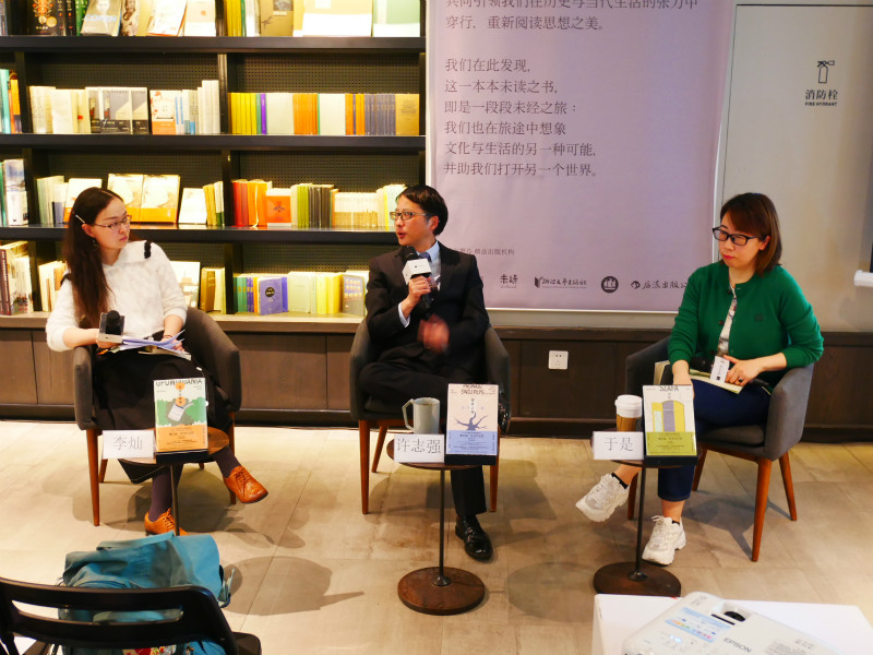 3月28日,浙江大學(xué)比較文學(xué)與世界文學(xué)研究所教授許志強(中),文學(xué)翻譯家、作家于是(右)與文學(xué)編輯李燦(左)做客單向空間杭州樂堤港店,就諾貝爾文學(xué)獎得主托卡爾丘克新書《糜骨之壤》展開對談。