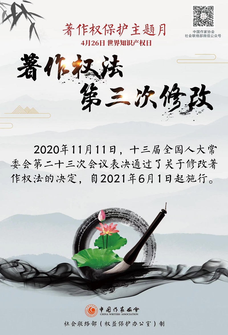 今年4月26日是第21個世界知識產(chǎn)權(quán)日。為深入學(xué)習(xí)貫徹習(xí)近平總書記在中央政治局集體學(xué)習(xí)時關(guān)于知識產(chǎn)權(quán)工作的重要講話精神,宣傳推廣2021年6月1日施行的新修改的《著作權(quán)法》,營造濃厚的著作權(quán)保護(hù)氛圍,增強(qiáng)廣大作家尊法學(xué)法守法用法的意識和能力,探索著作權(quán)保護(hù)工作的新思路、新辦法,中國作家協(xié)會社會聯(lián)絡(luò)部(權(quán)益保護(hù)辦公室)于本月正式啟動“著作權(quán)保護(hù)主題月”活動。