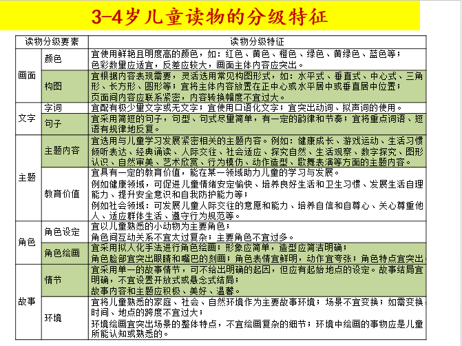 以3-4歲兒童讀物為例,圍繞10個(gè)要素的分級(jí)特征描述。
