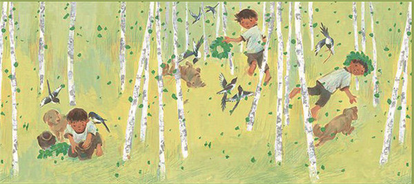 給年幼兒童的繪本,也應(yīng)該適度地進(jìn)行挫折教育、苦難教育。令我欽佩的是,《喜鵲窩》所反映的嚴(yán)酷的沙漠生活里的艱辛、磨難,并不是被大呼小叫地喊出來的,而是不動(dòng)聲色地表現(xiàn)出來的。之所以能不動(dòng)聲色,是因?yàn)樽髌繁澈笥袕?qiáng)大的信念在支撐。沙娃一家的家園被毀后,文字故事以走向沙漠深處結(jié)束,但是,后環(huán)襯依然在敘述故事。在后環(huán)襯上,近處有繁茂的白楊樹和“海子”,遠(yuǎn)處浮現(xiàn)出了綠洲。綠色,是希望的顏色。這顯然昭示了災(zāi)難后的希望,表現(xiàn)了樂觀主義的人生觀。對(duì)于寫給年幼兒童的繪本,表現(xiàn)虛無和悲觀,是死亡的暗示,表現(xiàn)達(dá)觀和樂觀,則是對(duì)生命的鼓舞。