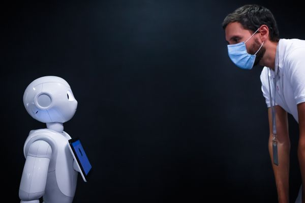 2020年9月10日,在法國(guó)巴黎的軟銀機(jī)器人公司,機(jī)器人Pepper展示檢測(cè)人們是否正確佩戴口罩的功能。軟銀機(jī)器人Pepper通過(guò)自帶的攝像頭掃描人臉,檢測(cè)對(duì)方有沒(méi)有佩戴口罩,并給予禮貌提醒和指導(dǎo)。新華社發(fā)(奧雷利安·莫里薩爾攝)