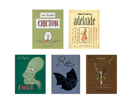 其次,溫格爾童書的主角大多是之前從未在童書上出現(xiàn)過的,與可愛無關(guān)、甚至讓人們反感的動(dòng)物——蟒蛇克里克塔(Crictor),章魚多多(Emile),袋鼠阿朵萊朵(Adelaide),蝙蝠魯弗斯(Rufus),禿鷲奧蘭多(Orlando)……