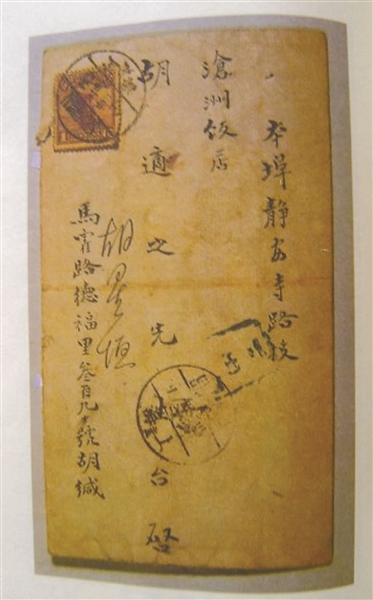 連信封也保存完好,“本埠靜安寺路投滄州飯店,胡適之先生臺啟,馬霍路德福里三百九十號胡緘”,郵戳為“十六年五月二十三日,上?!?。