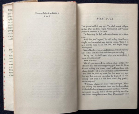 伯林英譯的《初戀》(First Love),1950年由倫敦哈米什·漢密爾頓(Hamish Hamilton)出版,與另一位(Alec Brown)英譯的《羅亭》(Rudin)合為一冊(cè),戴維·塞西爾爵士(Lord David Cecil)撰序。