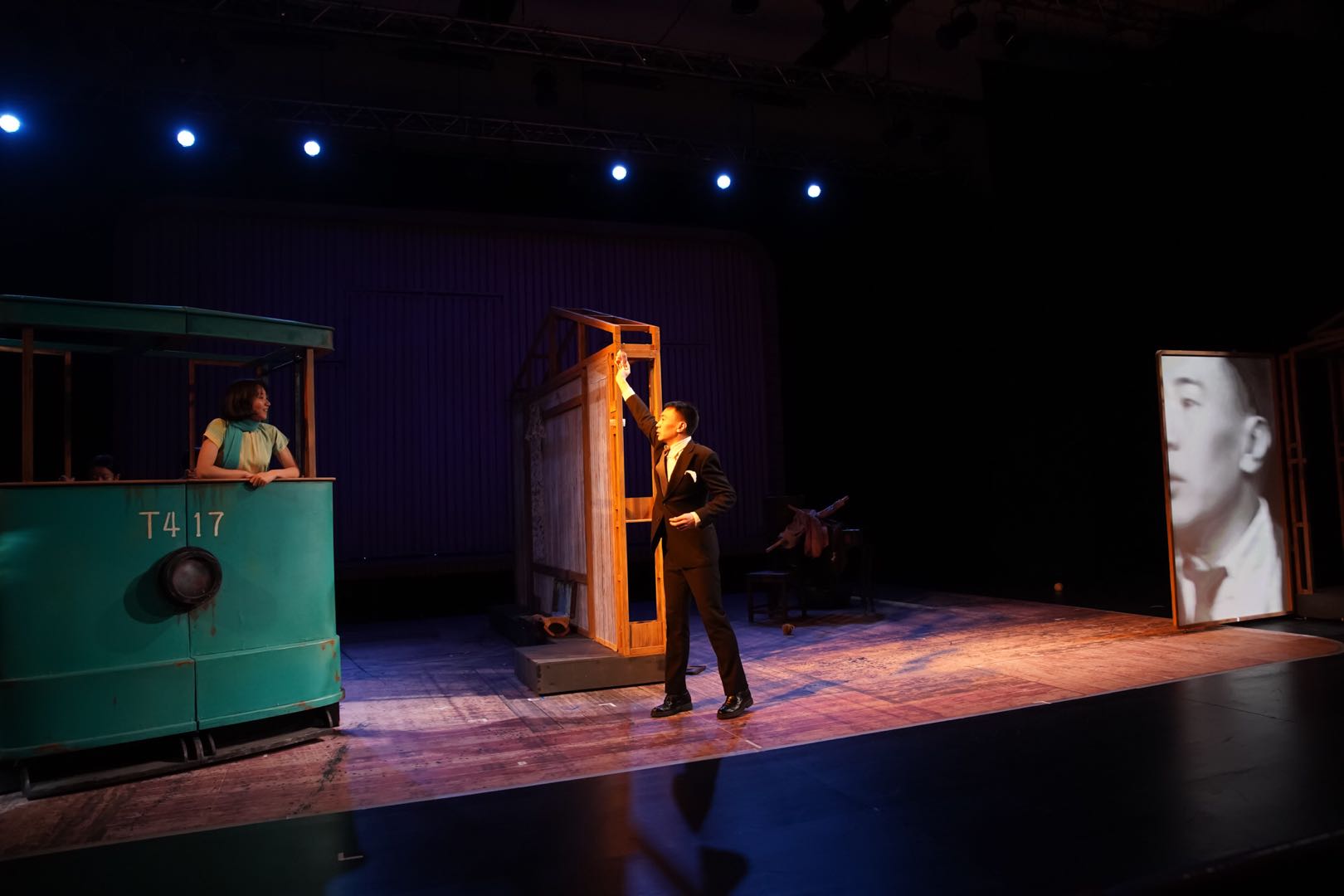 為了實(shí)現(xiàn)戲里戲外的“十字街頭”,該劇讓演員表演與影像多媒體互動(dòng)、結(jié)合,并不時(shí)讓老電影影像、現(xiàn)場(chǎng)拍攝影像與演員表演并置,利用間離效果,讓演員“跳進(jìn)跳出”。在舞臺(tái)布景上,該劇選取了具有年代感和地域特色的鐺鐺車為主要元素,通過它的變化呈現(xiàn)街景、鴿子間等空間。劇中,四個(gè)“畢業(yè)即失業(yè)”的青年蝸居在大都市最便宜的簡(jiǎn)易房?jī)?nèi),在十字路口的抉擇中,“老趙”和一墻之隔的“楊小姐”在不知身份的情況下漸生情愫。演員們也將跳出這些經(jīng)典形象,討論著沈西苓、趙丹、白楊等圍繞這部電影的老一代電影人軼事,并從這部電影作品和當(dāng)年的主創(chuàng)身上,表現(xiàn)青年人走出十字街頭的勇氣和力量。