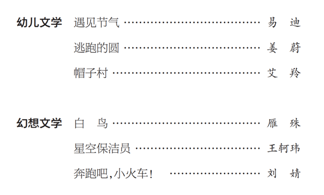 小說、童話、寓言、散文、詩歌、幼兒文學均可參評。參評作品字數(shù)最長不超過1.5萬字。每位作者參評作品只限一篇。