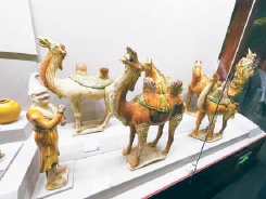 三彩牽駝俑及三彩駱駝 本報記者 閻彤攝