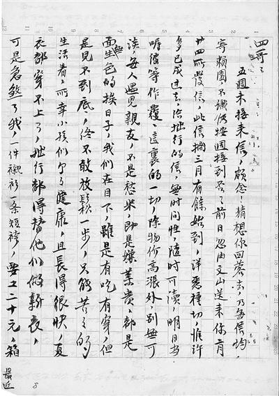 第二個打動我的是責任。分隔兩地,書信當中呈現更多的是柴米油鹽的生活,米漲價了,面粉漲價了,蔬菜漲價了……包括老虎灶灌的水漲價了。生活是很艱辛的,一個女性要帶著五個孩子,還要伺候她的婆母。張一貫生輝姑姑的時候四十歲,她的身體不是很好,出院的時候唇白腿軟。我覺得生活的擔子對她的健康也是有影響的。但責任心使然,她挑起了家庭的重擔。