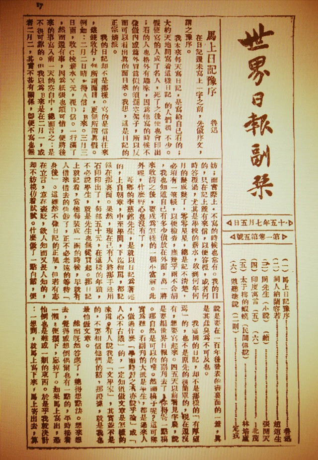 “馬上日記”名曰“日記”實為雜文,因此上文給“日記”二字加了引號。相應(yīng)地,為了便于論述,下文把每篇日記的日期作為篇名使用。發(fā)表《馬上日記》前,魯迅在7月5日《世界日報副刊》上發(fā)表了《馬上日記豫序》(收入《華蓋集續(xù)編》時改題為“豫序”)。在該序中,魯迅表示答應(yīng)了劉半農(nóng)的約稿后,“想來想去,覺得感想倒偶爾也有一點的,平時接著一懶,便擱下,忘掉了。如果馬上寫出,恐怕倒也是雜感一類的東西。于是乎我就決計:一想到,就馬上寫下來,馬上寄出去,算作我的畫到簿”[2]??梢?,所謂“馬上日記”就是對自己感想的即時記錄。在魯迅的“文體探索史”上,“馬上日記”的寫作具有多重意義。結(jié)合八年前創(chuàng)作的《狂人日記》來看,寫“馬上日記”是在繼續(xù)探索日記文體的可能性。小說可以寫成日記體,雜文同樣可以。在此意義上,《豫序》與12篇“日記”,《狂人日記》小序與正文,具有相同的結(jié)構(gòu)關(guān)系。魯迅通過二者之間的張力,強(qiáng)化、豐富作品的主題。《豫序》也是魯迅的“日記論”。他在其中介紹了“日記的正宗嫡派”、自己日記的流水賬寫法、同鄉(xiāng)李慈銘的“以日記為著述”,然后說明“馬上日記”的構(gòu)想。結(jié)合魯迅從前的《隨感錄》《忽然想到》等雜文系列來看,“馬上日記”這個題目本身再次確認(rèn)了雜文這種新興文體的本質(zhì)——即時性、現(xiàn)實性、針對性、個人性。“隨感”“忽然想到”“馬上”等詞語表達(dá)的是短暫的時間狀態(tài),“感”與“想”都有特定的主體,相應(yīng)地,“錄”或“記”這種書寫行為受到時間與主體的制約,會對文體形式提出要求。