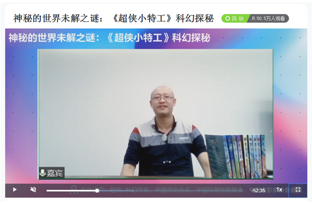 5月8日晚7點(diǎn),科幻作家超俠在線上為讀者和青年科幻作家?guī)怼吧衩氐氖澜缥唇庵i:《超俠小特工》科幻探秘”直播講座。本次活動由中國科學(xué)技術(shù)出版社有限公司主辦,中國科普作家協(xié)會科幻創(chuàng)作研究基地承辦,科創(chuàng)中國、科技工作者之家、科普中國提供支持?;顒釉诳萍脊ぷ髡咧摇⒖破罩袊?、微博、抖音、新華網(wǎng)、知乎、嗶哩嗶哩等多個平臺同步直播,線上觀看人次超過50萬。