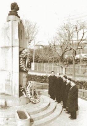 1956年,巴金(右一)等在上海向普希金紀(jì)念碑獻(xiàn)花。