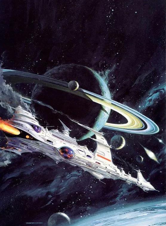 那時(shí)常常出現(xiàn)的造型還有1977年《黑星》中尖頭滑翔翼一般的飛船?!昂谛恰碧?hào)的設(shè)計(jì)師羅恩·科布不僅是一名漫畫(huà)家,還是NASA的官方美術(shù)設(shè)計(jì)師。