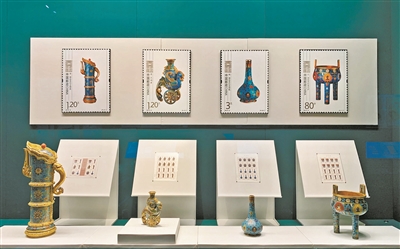 展覽現(xiàn)場,共展出郵票56套1732枚(含故宮主題郵票52套1590枚),郵票手稿等珍貴展品54件,聯(lián)合發(fā)行首日封13件;配合郵票展出的25件故宮文物,涵蓋書畫、玉器、琺瑯器、青銅器、瓷器、家具等多個(gè)門類,與同主題的郵票對(duì)比展出,交相輝映。