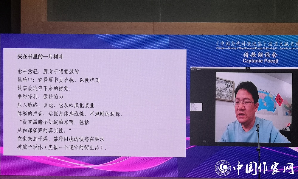 在詩(shī)歌朗誦會(huì)環(huán)節(jié),吉狄馬加深情朗誦了新近創(chuàng)作的長(zhǎng)詩(shī)《裂開(kāi)的星球》(節(jié)選),表達(dá)出對(duì)人類(lèi)生存環(huán)境與未來(lái)命運(yùn)的深切思考,引起現(xiàn)場(chǎng)觀眾共鳴。湯養(yǎng)宗、胡弦、陳先發(fā)、張執(zhí)浩等中國(guó)詩(shī)人和李周、卡塔基娜·薩雷克等波蘭譯者分別用漢語(yǔ)和波蘭語(yǔ),在現(xiàn)場(chǎng)和線上朗誦了《在漢詩(shī)中國(guó)》《平安夜》《夾在書(shū)里的一片樹(shù)葉》《琥珀里的昆蟲(chóng)》《晚星》《古老的信封》《被詞語(yǔ)找到的人》等入選本詩(shī)集的作品。詩(shī)人和譯者的精彩演繹引發(fā)陣陣掌聲,現(xiàn)場(chǎng)觀眾在漢語(yǔ)和波蘭語(yǔ)的音律之美中穿行,領(lǐng)略了詩(shī)歌跨越語(yǔ)言的獨(dú)特魅力。