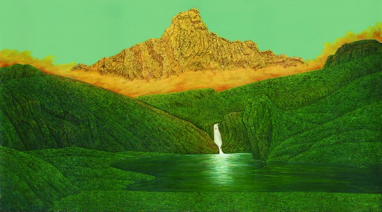 近年來,在我為大興機場創(chuàng)作的油畫《新輝煌》中,這種創(chuàng)作觀念就體現(xiàn)得更加典型。這幅作品中,我用一個具象的表現(xiàn)高原雪山在陽光下呈現(xiàn)金色光芒的那種神圣的、瞬間的人間仙境似的畫面,把習近平總書記的“綠水青山就是金山銀山”的思想表現(xiàn)出來了?!敖鹕姐y山”對應著大自然最美的景觀,綠色又代表著一種蓬勃向上的生命力。這樣一幅畫的創(chuàng)作靈感來自當年我在西藏的親身體驗,也來自一個畫家多年來對藝術創(chuàng)作的深度思考。