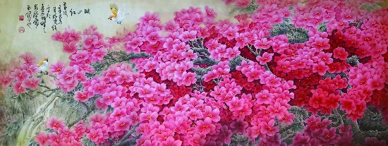 或者,這就是陳奕純國畫《映山紅》所要表達(dá)的藝術(shù)思想。這是橫幅的作品,面對(duì)作品,我們有一種如置身于山野的感覺,漫山遍野的映山紅撲面而來,濃烈、強(qiáng)烈、熱烈,蔚然壯觀。
