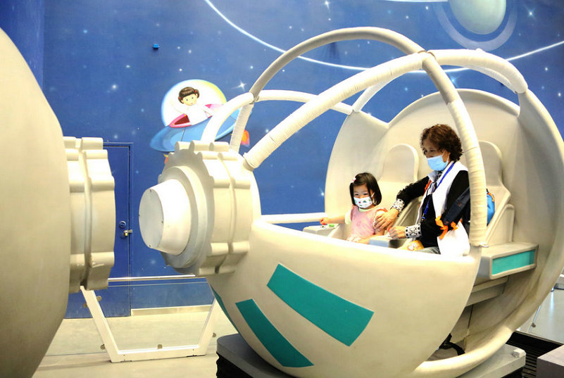 2021年5月19日,小朋友由家人陪同在中國科學(xué)技術(shù)館體驗“飛船對接運行” 。新華網(wǎng)發(fā)(劉廣生 攝于北京)