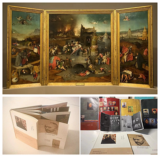 上圖:博斯三聯(lián)畫;下圖:《觀看的技藝》。三聯(lián)畫源于歐洲宗教祭壇畫,后來被文藝復(fù)興時期的畫家們采用,以三塊表現(xiàn)某內(nèi)容的繪畫橫排展示為一組,一般中間的那幅畫作最大。當(dāng)兩翼的畫板疊在一起時,正好覆滿中間的畫板,起到保護(hù)的作用,也方便拆卸運(yùn)輸?!队^看的技藝》里插圖的呈現(xiàn)方式借鑒了三聯(lián)畫的形式,但是和傳統(tǒng)三聯(lián)畫仍有所區(qū)別。
